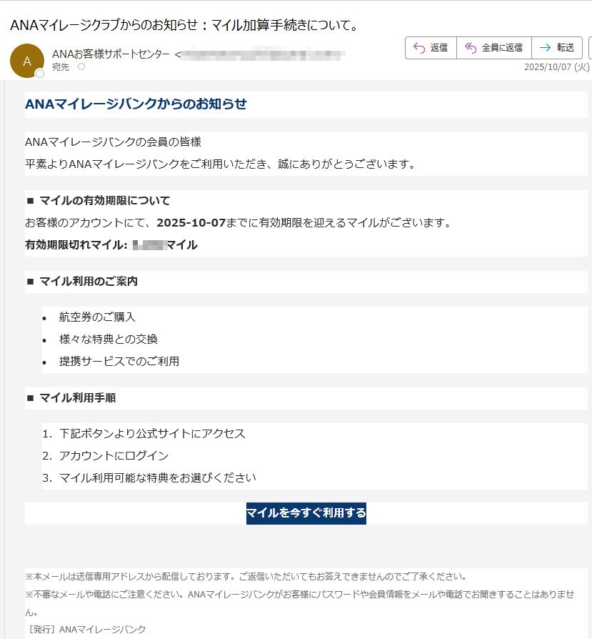 ![ANAマイレージバンクからのお知らせANAマイレージバンクの会員の皆様平素よりANAマイレージバンクをご利用いただき、誠にありがとうございます。■ マイルの有効期限についてお客様のアカウントにて、2025-10-07までに有効期限を迎えるマイルがございます。有効期限切れマイル: 5,454マイル■ マイル利用のご案内•航空券のご購入 •様々な特典との交換 •提携サービスでのご利用 ■ マイル利用手順1.下記ボタンより公式サイトにアクセス 2.アカウントにログイン 3.マイル利用可能な特典をお選びください マイルを今すぐ利用する ※本メールは送信専用アドレスから配信しております。ご返信いただいてもお答えできませんのでご了承ください。※不審なメールや電話にご注意ください。ANAマイレージバンクがお客様にパスワードや会員情報をメールや電話でお聞きすることはありません。[発行]ANAマイレージバンク](../../images/alert/2025/10m/nise_mail1007_15.png)