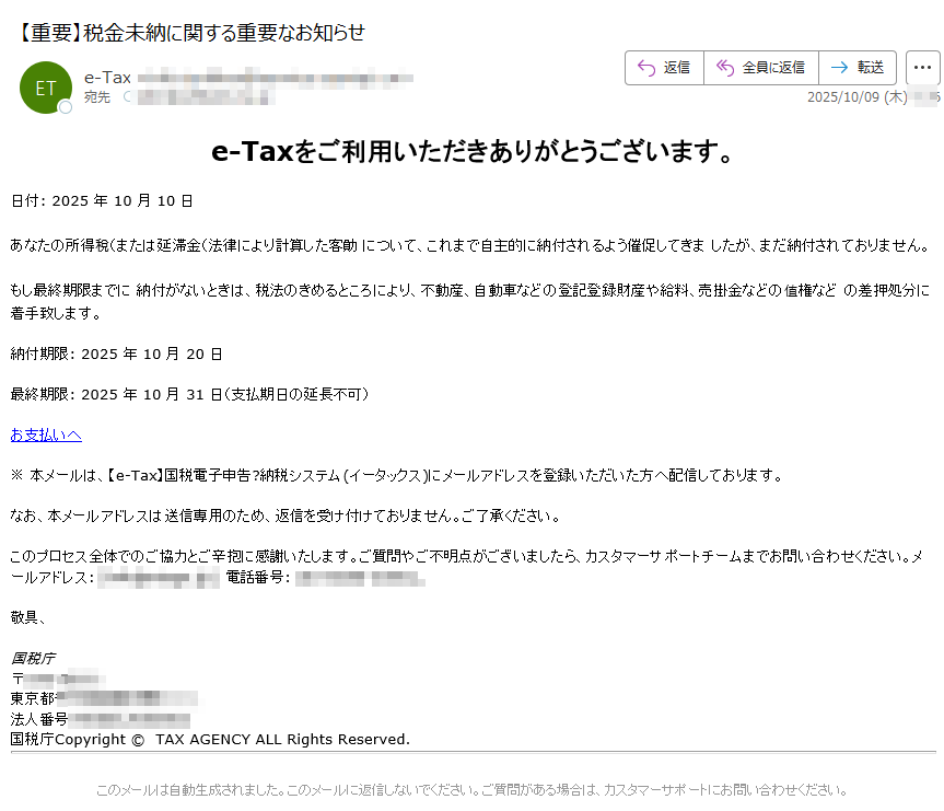 ![e-Taxをご利用いただきありがとうございます。日付: 2025 年 10 月 10 日あなたの所得稅(または延滞金(法律により計算した客勛 について、これまで自主的に納付されるよう催促してきま したが、まだ納付されておりません。もし最終期限までに 納付がないときは、税法のきめるところにより、不動産、自動車などの登記登録財産や給料、売掛金などの值権など の差押処分に着手致します。 納付期限: 2025 年 10 月 20 日最終期限: 2025 年 10 月 31 日(支払期日の延長不可)お支払いへ※ 本メールは、【e-Tax】国税電子申告?納税システム(イータックス)にメールアドレスを登録いただいた方へ配信しております。なお、本メールアドレスは送信専用のため、返信を受け付けておりません。ご了承ください。このプロセス全体でのご協力とご辛抱に感謝いたします。ご質問やご不明点がございましたら、カスタマーサポートチームまでお問い合わせください。メールアドレス: []、電話番号: []。敬具、国税庁〒東京都法人番号国税庁Copyright © TAX AGENCY ALL Rights Reserved. このメールは自動生成されました。このメールに返信しないでください。ご質問がある場合は、カスタマーサポートにお問い合わせください。](../../images/alert/2025/10m/nise_mail1009_05.png)