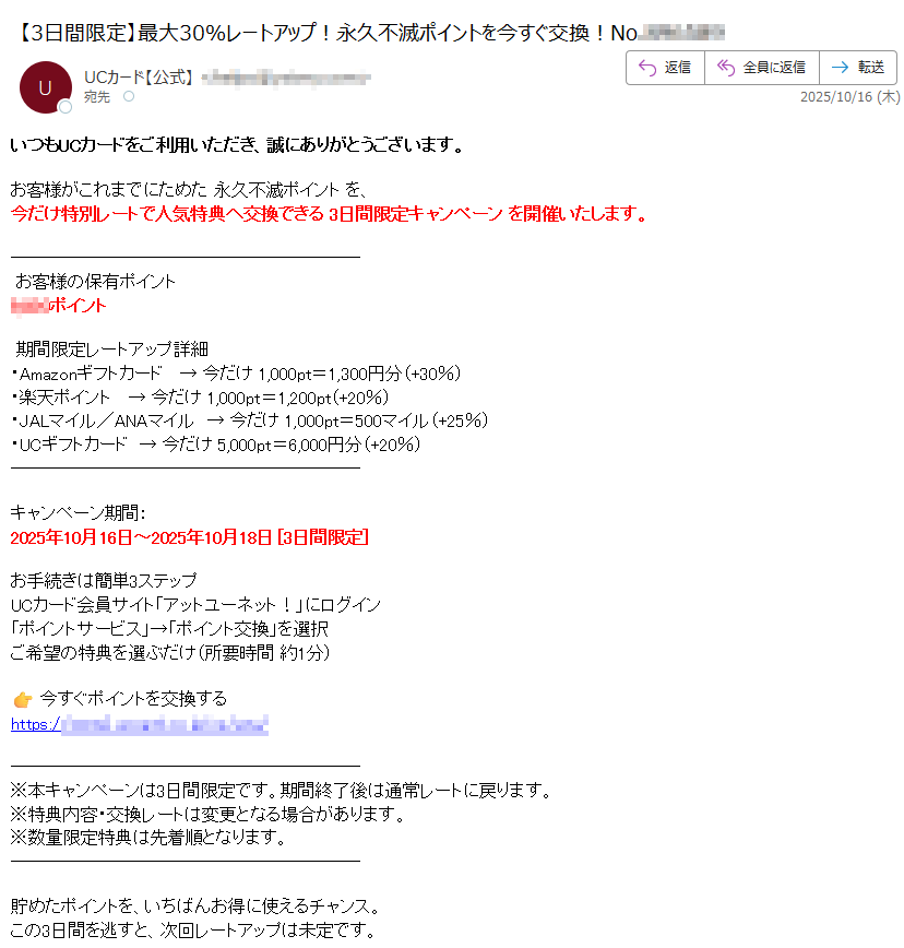 ![いつもUCカードをご利用いただき、誠にありがとうございます。お客様がこれまでにためた 永久不滅ポイント を、今だけ特別レートで人気特典へ交換できる 3日間限定キャンペーン を開催いたします。 お客様の保有ポイントポイント 期間限定レートアップ詳細・Amazonギフトカード → 今だけ 1,000pt=1,300円分(+30%)・楽天ポイント → 今だけ 1,000pt=1,200pt(+20%)・JALマイル/ANAマイル → 今だけ 1,000pt=500マイル(+25%)・UCギフトカード → 今だけ 5,000pt=6,000円分(+20%)キャンペーン期間:2025年10月16日~2025年10月18日[3日間限定]お手続きは簡単3ステップUCカード会員サイト「アットユーネット!」にログイン「ポイントサービス」→「ポイント交換」を選択ご希望の特典を選ぶだけ(所要時間 約1分)今すぐポイントを交換するhttps:/※本キャンペーンは3日間限定です。期間終了後は通常レートに戻ります。※特典内容・交換レートは変更となる場合があります。※数量限定特典は先着順となります。貯めたポイントを、いちばんお得に使えるチャンス。この3日間を逃すと、次回レートアップは未定です。どうぞお早めにお手続きください。UCカード(ユーシーカード株式会社)https://© 2025 UC CARD Co., Ltd.](../../images/alert/2025/10m/nise_mail1017_01.png)