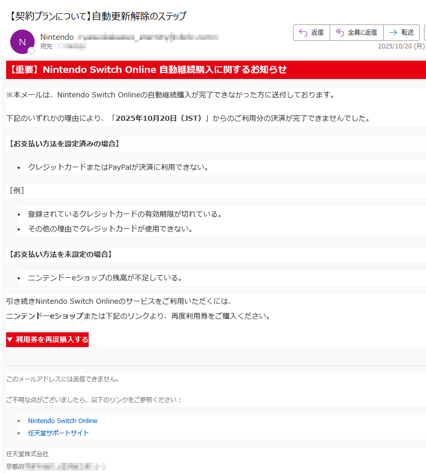 ![※本メールは、Nintendo Switch Onlineの自動継続購入が完了できなかった方に送付をしています。 以下のいずれかの理由のため、「 2025/10/31 (JST)」からのご利用分の決済を行うことができませんでした。 【お支払い方法を設定済みの場合】 ・お支払い方法(クレジットカードまたはPayPal)が決済に利用できない。 [例] -登録されているクレジットカードの有効期限が切れている。 -何らかの理由でそのクレジットカードが利用できない。 【お支払い方法を未設定の場合】 ・ニンテンドーeショップの残高が不足している 引き続きNintendo Switch Onlineのサービスをご利用いただく場合は、ニンテンドーeショップまたは、以下のリンクより、再度利用券をご購入ください。 ▼利用券を再度購入する https:/このメールアドレスには返信できません。 ご不明な点等がございましたら、下記までお問い合わせください。 ▽Nintendo Switch Online https:/▽任天堂サポートサイト https:// 任天堂株式会社 京都府](../../images/alert/2025/10m/nise_mail1031_16.png)