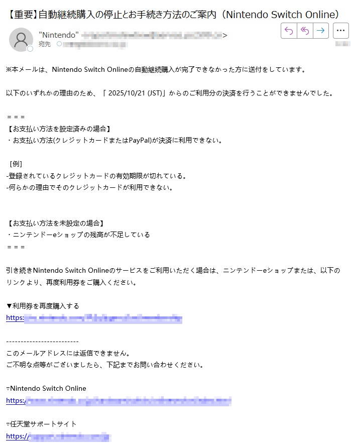 ![※本メールは、Nintendo Switch Onlineの自動継続購入が完了できなかった方に送付をしています。 以下のいずれかの理由のため、「 2025/10/21 (JST)」からのご利用分の決済を行うことができませんでした。 【お支払い方法を設定済みの場合】 ・お支払い方法(クレジットカードまたはPayPal)が決済に利用できない。 [例] -登録されているクレジットカードの有効期限が切れている。 -何らかの理由でそのクレジットカードが利用できない。 【お支払い方法を未設定の場合】 ・ニンテンドーeショップの残高が不足している 引き続きNintendo Switch Onlineのサービスをご利用いただく場合は、ニンテンドーeショップまたは、以下のリンクより、再度利用券をご購入ください。 ▼利用券を再度購入する https://このメールアドレスには返信できません。 ご不明な点等がございましたら、下記までお問い合わせください。 ▽Nintendo Switch Online https:/▽任天堂サポートサイト https:// 任天堂株式会社 京都府](../../images/alert/2025/10m/nise_mail1021_08.png)