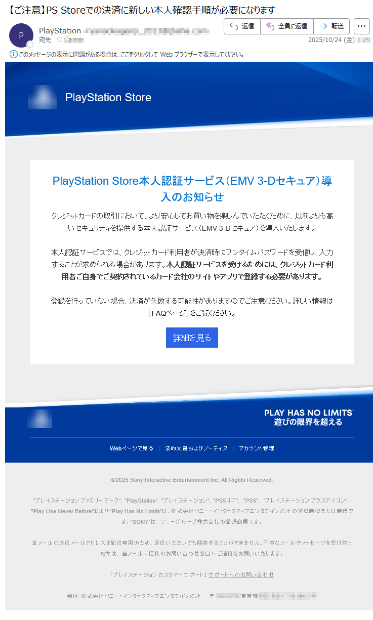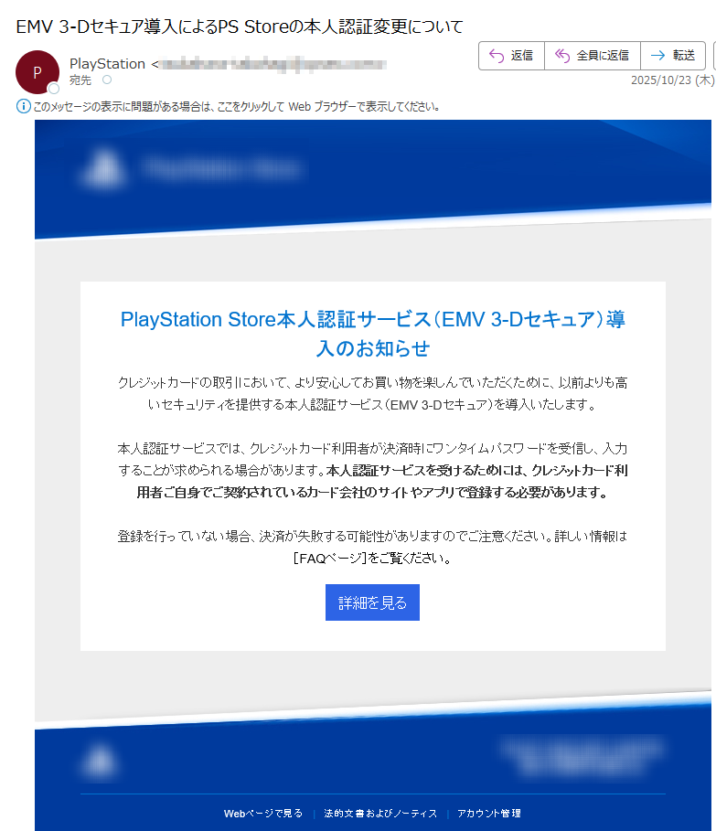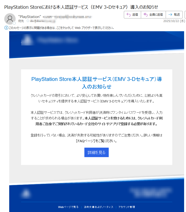 PlayStation Storeになりすました偽メール「件名:EMV 3-Dセキュア導入による認証手続き変更のお知らせ」(本偽メールは、実在の企業と無関係に送信されたものです)