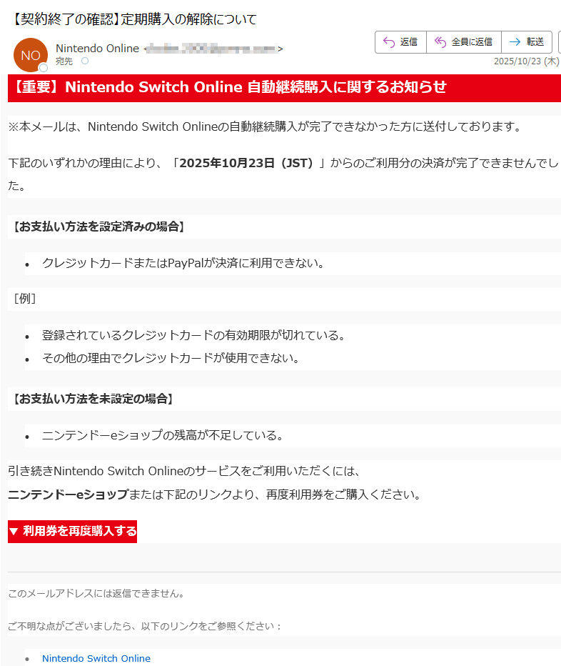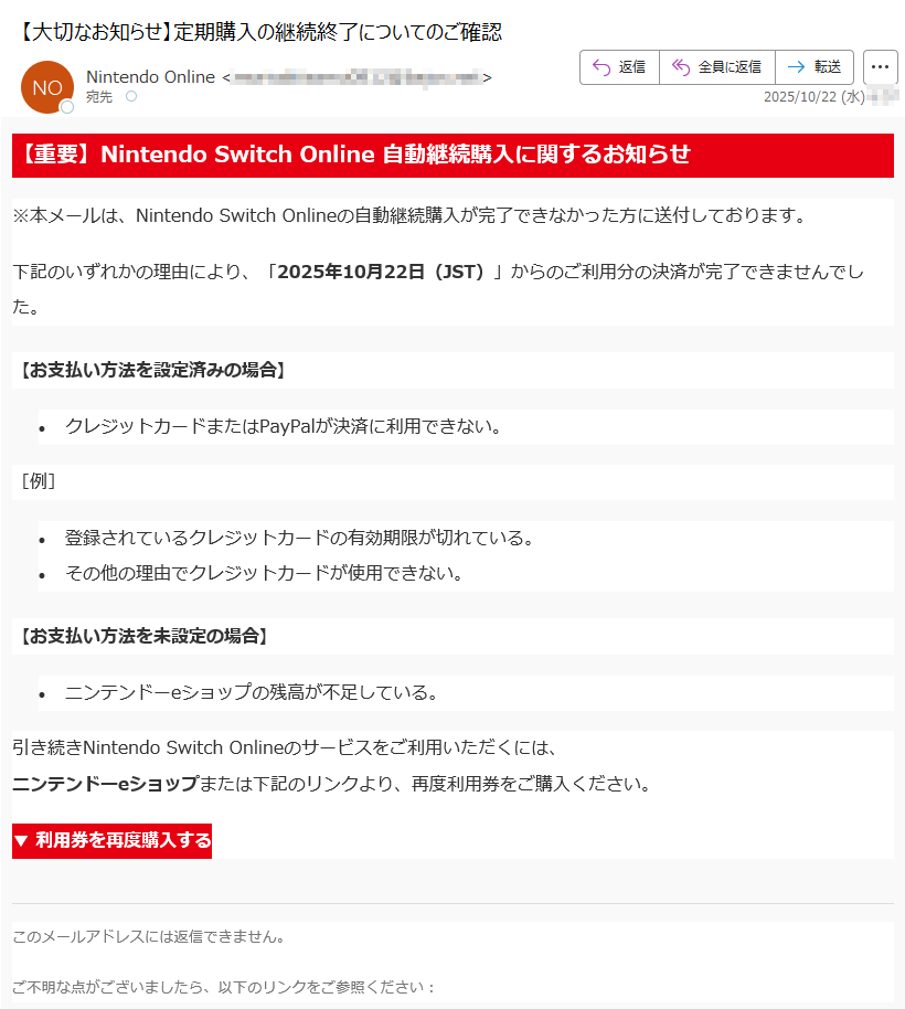 ![【重要】Nintendo Switch Online 自動継続購入に関するお知らせ ※本メールは、Nintendo Switch Onlineの自動継続購入が完了できなかった方に送付しております。下記のいずれかの理由により、「2025年10月27日(JST)」からのご利用分の決済が完了できませんでした。【お支払い方法を設定済みの場合】•クレジットカードまたはPayPalが決済に利用できない。 [例]•登録されているクレジットカードの有効期限が切れている。 •その他の理由でクレジットカードが使用できない。 【お支払い方法を未設定の場合】•ニンテンドーeショップの残高が不足している。 引き続きNintendo Switch Onlineのサービスをご利用いただくには、ニンテンドーeショップまたは下記のリンクより、再度利用券をご購入ください。利用券を再度購入する このメールアドレスには返信できません。ご不明な点がございましたら、以下のリンクをご参照ください:•Nintendo Switch Online •任天堂サポートサイト 任天堂株式会社京都府](../../images/alert/2025/10m/nise_mail1027_10.png)