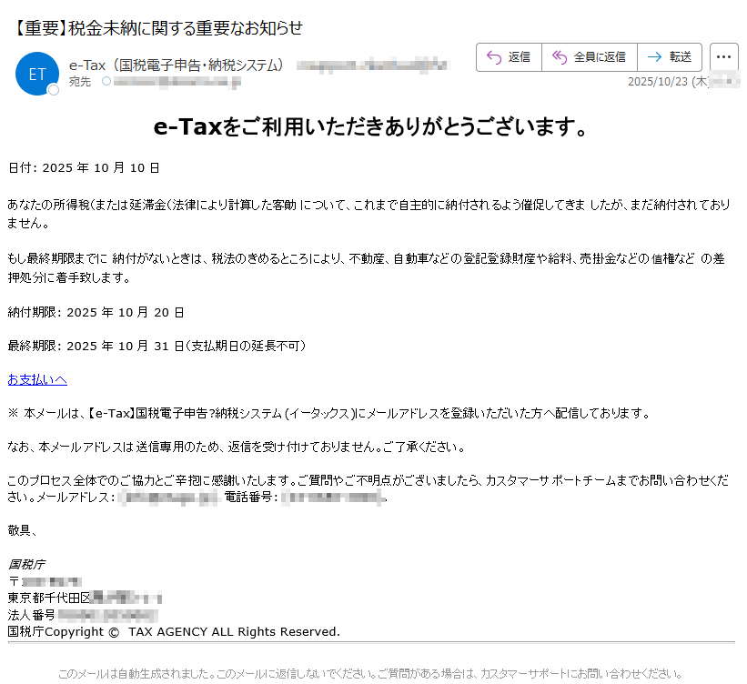 ![e-Taxをご利用いただきありがとうございます。日付: 2025 年 10 月 10 日あなたの所得稅(または延滞金(法律により計算した客勛 について、これまで自主的に納付されるよう催促してきま したが、まだ納付されておりません。もし最終期限までに 納付がないときは、税法のきめるところにより、不動産、自動車などの登記登録財産や給料、売掛金などの值権など の差押処分に着手致します。 納付期限: 2025 年 10 月 20 日最終期限: 2025 年 10 月 31 日(支払期日の延長不可)お支払いへ※ 本メールは、【e-Tax】国税電子申告?納税システム(イータックス)にメールアドレスを登録いただいた方へ配信しております。なお、本メールアドレスは送信専用のため、返信を受け付けておりません。ご了承ください。このプロセス全体でのご協力とご辛抱に感謝いたします。ご質問やご不明点がございましたら、カスタマーサポートチームまでお問い合わせください。メールアドレス: []、電話番号: [0]。敬具、国税庁〒東京都法人番号国税庁Copyright © TAX AGENCY ALL Rights Reserved. このメールは自動生成されました。このメールに返信しないでください。ご質問がある場合は、カスタマーサポートにお問い合わせください。](../../images/alert/2025/10m/nise_mail1023_09.png)