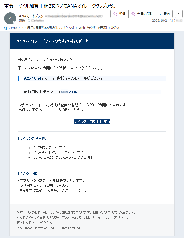 ![ANAマイレージバンクからのお知らせANAマイレージバンク会員の皆さまへ平素よりANAをご利用いただき誠にありがとうございます。2025-10-24までに有効期限を迎えるマイルがございます。有効期限切れ予定マイル:*****マイルお手持ちのマイルは、特典航空券や各種ギフトなどにご利用いただけます。詳細は以下の公式サイトよりご確認ください。マイルを今すぐ利用する【マイルのご利用例】•特典航空券への交換•ANA提携ポイント・ギフトへの交換•ANAショッピングA-styleなどでのご利用【ご注意事項】・有効期限を過ぎたマイルは失効いたします。・期限内のご利用をお願いいたします。・マイル数は2025年10月時点での集計値です。※本メールは送信専用アドレスから自動送信されています。返信いただいても対応できません。※ANAがメールや電話でパスワード等をお尋ねすることはございません。ご注意ください。[発行]ANAマイレージバンク©AllNipponAirwaysCo.,Ltd.AllRightsReserved.](../../images/alert/2025/10m/nise_mail1024_13.png)