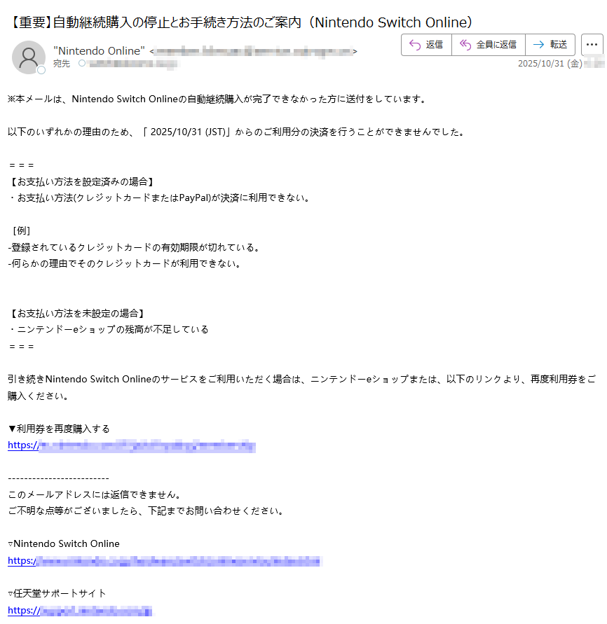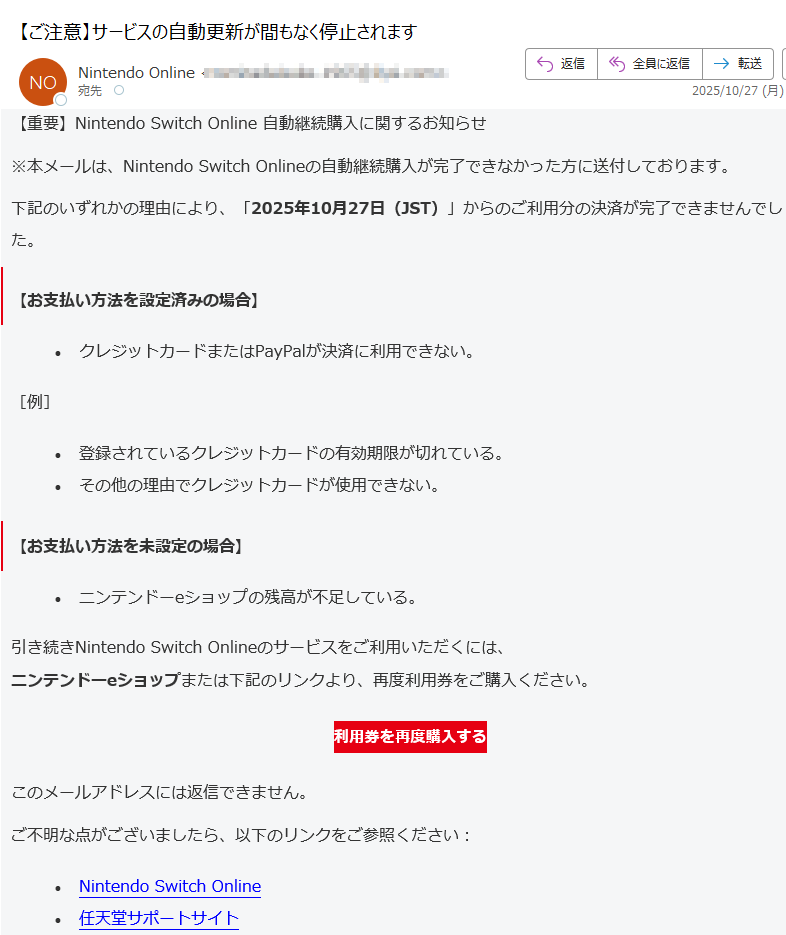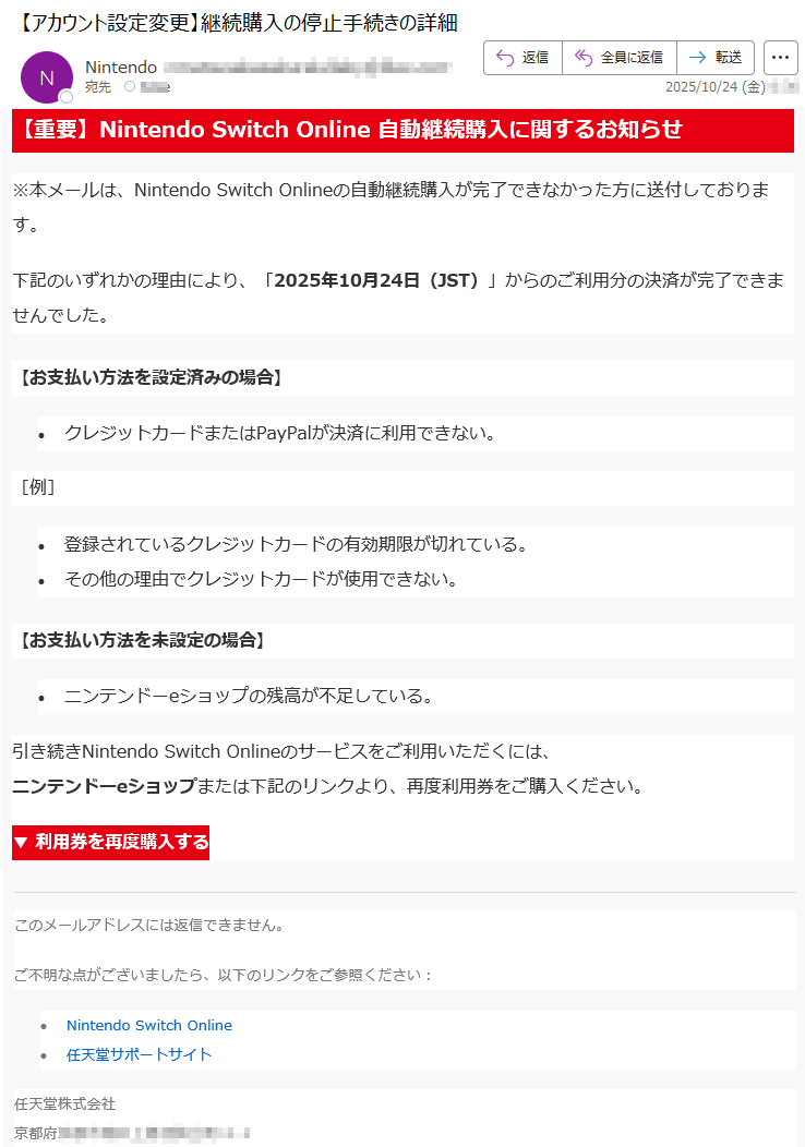 ![【重要】NintendoSwitchOnline自動継続購入に関するお知らせ※本メールは、NintendoSwitchOnlineの自動継続購入が完了できなかった方に送付しております。下記のいずれかの理由により、「2025年10月24日(JST)」からのご利用分の決済が完了できませんでした。【お支払い方法を設定済みの場合】•クレジットカードまたはPayPalが決済に利用できない。[例]•登録されているクレジットカードの有効期限が切れている。•その他の理由でクレジットカードが使用できない。【お支払い方法を未設定の場合】•ニンテンドーeショップの残高が不足している。引き続きNintendoSwitchOnlineのサービスをご利用いただくには、ニンテンドーeショップまたは下記のリンクより、再度利用券をご購入ください。▼利用券を再度購入するこのメールアドレスには返信できません。ご不明な点がございましたら、以下のリンクをご参照ください:•NintendoSwitchOnline•任天堂サポートサイト任天堂株式会社京都府*****](../../images/alert/2025/10m/nise_mail1024_17.png)