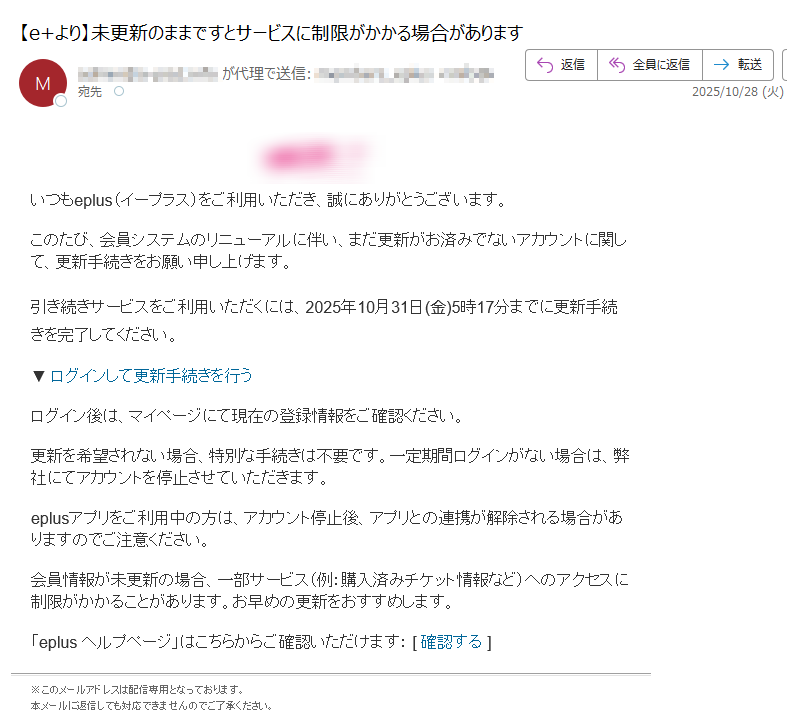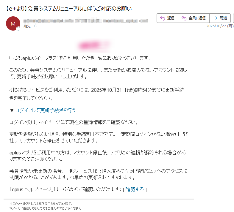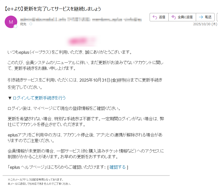 ![いつもeplus(イープラス)をご利用いただき、誠にありがとうございます。 このたび、会員システムのリニューアルに伴い、まだ更新がお済みでないアカウントに関して、更新手続きをお願い申し上げます。 引き続きサービスをご利用いただくには、2025年10月31日(金)5時17分までに更新手続きを完了してください。▼ ログインして更新手続きを行う ログイン後は、マイページにて現在の登録情報をご確認ください。 更新を希望されない場合、特別な手続きは不要です。一定期間ログインがない場合は、弊社にてアカウントを停止させていただきます。 eplusアプリをご利用中の方は、アカウント停止後、アプリとの連携が解除される場合がありますのでご注意ください。 会員情報が未更新の場合、一部サービス(例:購入済みチケット情報など)へのアクセスに制限がかかることがあります。お早めの更新をおすすめします。 「eplus ヘルプページ」はこちらからご確認いただけます: [ 確認する ] ※このメールアドレスは配信専用となっております。本メールに返信しても対応できませんのでご了承ください。](../../images/alert/2025/10m/nise_mail1028_03.png)