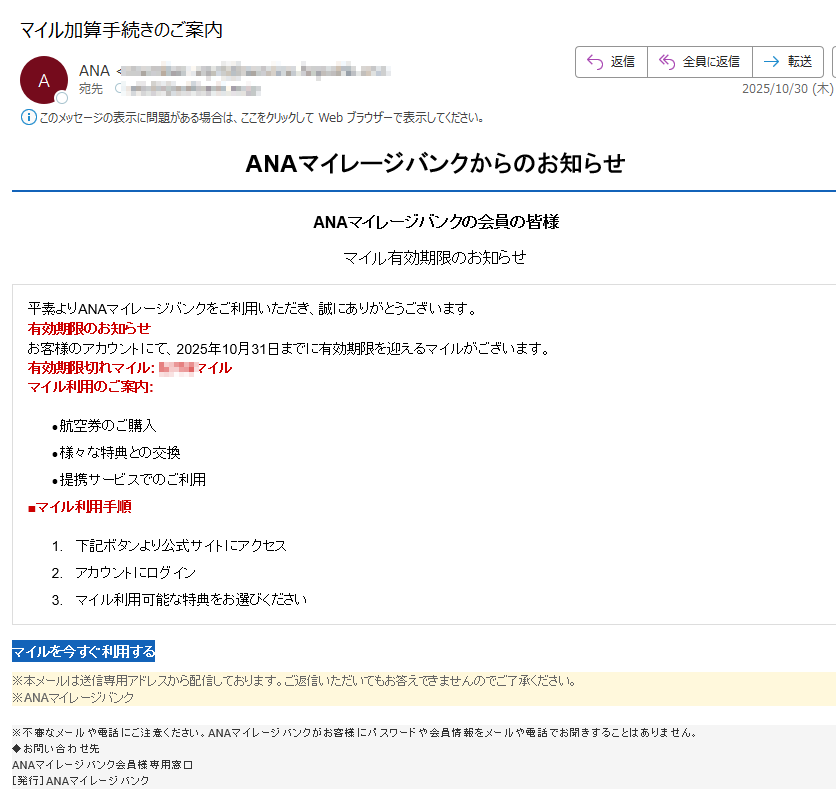 ![ANAマイレージバンクからのお知らせANAマイレージバンクの会員の皆様マイル有効期限のお知らせ平素よりANAマイレージバンクをご利用いただき、誠にありがとうございます。有効期限のお知らせお客様のアカウントにて、2025年10月31日までに有効期限を迎えるマイルがございます。有効期限切れマイル: マイルマイル利用のご案内:•航空券のご購入 •様々な特典との交換 •提携サービスでのご利用■マイル利用手順1.下記ボタンより公式サイトにアクセス 2.アカウントにログイン 3.マイル利用可能な特典をお選びくださいマイルを今すぐ利用する ※本メールは送信専用アドレスから配信しております。ご返信いただいてもお答えできませんのでご了承ください。※ANAマイレージバンク※不審なメールや電話にご注意ください。ANAマイレージバンクがお客様にパスワードや会員情報をメールや電話でお聞きすることはありません。◆お問い合わせ先ANAマイレージバンク会員様専用窓口[発行]ANAマイレージバンク](../../images/alert/2025/10m/nise_mail1030_11.png)
