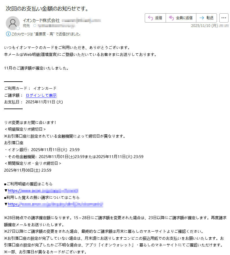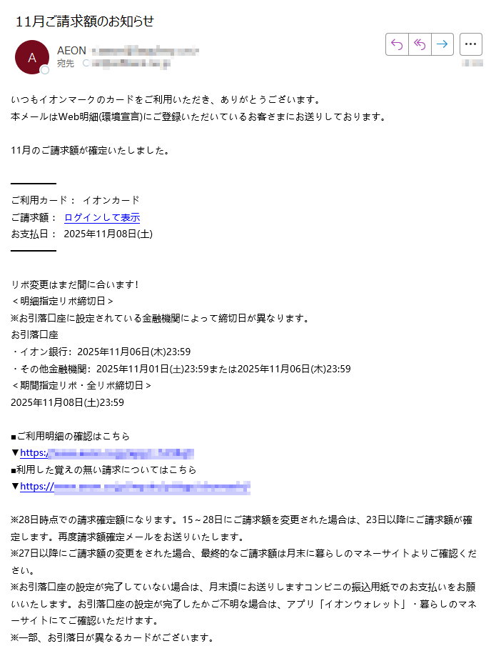 ![いつもイオンマークのカードをご利用いただき、ありがとうございます。 本メールはWeb明細(環境宣言)にご登録いただいているお客さまにお送りしております。 11月のご請求額が確定いたしました。 ご利用カード : イオンカードご請求額 : ログインして表示 お支払日 : 2025年11月11日 (火) リボ変更はまだ間に合います! <明細指定リボ締切日> ※お引落口座に設定されている金融機関によって締切日が異なります。 お引落口座 ・イオン銀行:2025年11月11日(火) 23:59 ・その他金融機関:2025年11月01日(土)23:59または2025年11月11日(火) 23:59 <期間指定リボ・全リボ締切日> 2025年11月08日(土) 23:59■ご利用明細の確認はこちら▼https://■利用した覚えの無い請求についてはこちら▼https:/※28日時点での請求確定額になります。15~28日にご請求額を変更された場合は、23日以降にご請求額が確定します。再度請求額確定メールをお送りいたします。 ※27日以降にご請求額の変更をされた場合、最終的なご請求額は月末に暮らしのマネーサイトよりご確認ください。 ※お引落口座の設定が完了していない場合は、月末頃にお送りしますコンビニの振込用紙でのお支払いをお願いいたします。お引落口座の設定が完了したかご不明な場合は、アプリ「イオンウォレット」・暮らしのマネーサイトにてご確認いただけます。 ※一部、お引落日が異なるカードがございます。 ※リボ払いは、前月11日~今月10日までのショッピングご利用分の1回払いとボーナス一括払いをリボ払いへ変更いただけます。 ※明細指定リボはご利用明細1件ごとにリボ払いへ変更いただけます。 ■ご請求明細書の郵送について ご請求明細書の郵送を希望される場合、暮らしのマネーサイトよりお手続きください。なお、「ご請求明細書発行手数料」として1通あたり110円(税込)をご負担いただきます。 毎月10日までの登録で翌月のご請求分より郵送いたします。 暮らしのマネーサイト>「メニュー」>「各種お手続き・登録変更」>「ご請求明細書のお受取り方法設定」よりご変更をお願いいたします。 ■お問い合わせ先 ▼イオンカード 暮らしのマネーサイト>「メニュー」>「お客さまサポート」 ▼イオン銀行 イオン銀行ホームページ>「メニュー」>「お客さまサポート」 このメールアドレス[]は送信専用アドレスのため、ご返信いただいてもご用件は承れません。 当メールにお心当たりのない方は、大変お手数をお掛けいたしますが、その旨をお書き添えいただき下記アドレスまでお送りください。 発行:株式会社イオン銀行 業務受託会社:イオンフィナンシャルサービス株式会社 このメールに掲載された内容を許可なく転載することを禁じます。](../../images/alert/2025/11m/nise_mail1111_01.png)