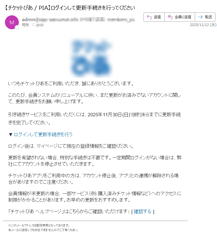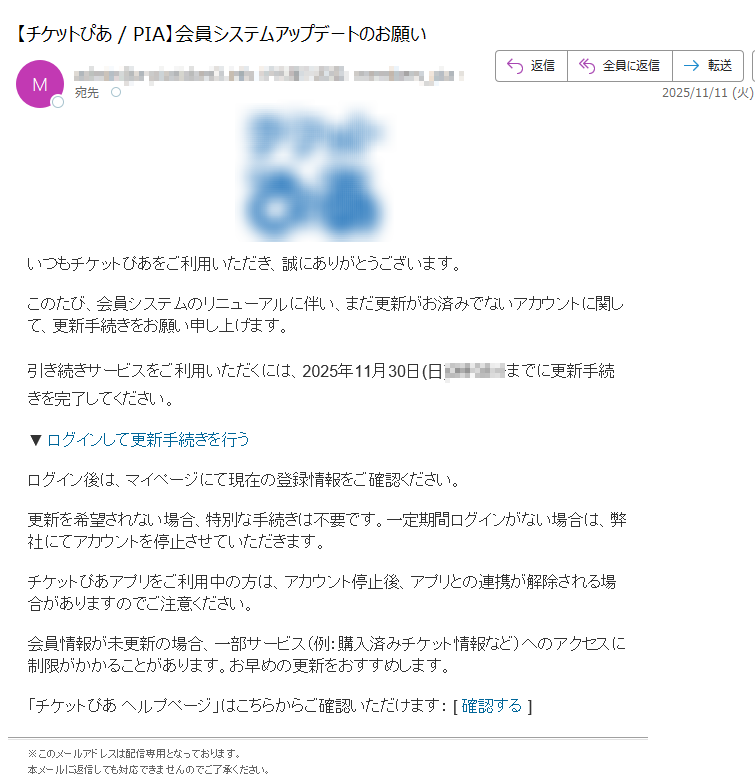 ![いつもチケットぴあをご利用いただき、誠にありがとうございます。 このたび、会員システムのリニューアルに伴い、まだ更新がお済みでないアカウントに関して、更新手続きをお願い申し上げます。 引き続きサービスをご利用いただくには、2025年11月30日(日)までに更新手続きを完了してください。▼ ログインして更新手続きを行う ログイン後は、マイページにて現在の登録情報をご確認ください。 更新を希望されない場合、特別な手続きは不要です。一定期間ログインがない場合は、弊社にてアカウントを停止させていただきます。チケットぴあアプリをご利用中の方は、アカウント停止後、アプリとの連携が解除される場合がありますのでご注意ください。 会員情報が未更新の場合、一部サービス(例:購入済みチケット情報など)へのアクセスに制限がかかることがあります。お早めの更新をおすすめします。 「チケットぴあ ヘルプページ」はこちらからご確認いただけます: [ 確認する ] ※このメールアドレスは配信専用となっております。本メールに返信しても対応できませんのでご了承ください。](../../images/alert/2025/11m/nise_mail1112_26.png)