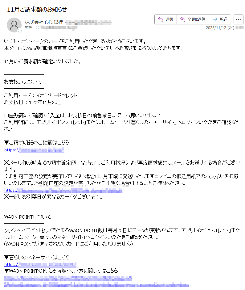 ![いつもイオンマークのカードをご利用いただき、ありがとうございます。本メールはWeb明細(環境宣言)にご登録いただいているお客さまにお送りしております。11月のご請求額が確定いたしました。お支払いについてご利用カード : イオンカードセレクトお支払日 :2025年11月30日口座残高のご確認・ご入金は、お支払日の前営業日までにお願いいたします。ご利用明細は、アプリ「イオンウォレット」またはホームページ「暮らしのマネーサイト」へログインいただきご確認ください。▼ご請求明細のご確認はこちらhttps:/※メール作成時点での請求確定額になります。ご利用状況により再度請求額確定メールをお送りする場合がございます。※お引落口座の設定が完了していない場合は、月末頃に発送いたしますコンビニの振込用紙でのお支払いをお願いいたします。お引落口座の設定が完了したかご不明な場合は下記よりご確認ください。https:/※一部、お引落日が異なるカードがございます。WAON POINTについてクレジット・デビット払いでたまるWAON POINT数は毎月25日にデータが更新されます。アプリ「イオンウォレット」またはホームページ「暮らしのマネーサイト」へログインいただきご確認ください。(WAON POINTが進呈されないカードはご利用いただけません)▼暮らしのマネーサイトはこちらhttps:/▼WAON POINTの使える店舗・使い方に関してはこちらhttps://アプリやメールでおトクな情報が受取れます! イオンカード公式アプリ「イオンウォレット」ならご利用明細の確認やポイント交換はもちろん、会員限定クーポンも利用でき便利でおトク♪▼iPhoneをお持ちの方はこちらhttps:/▼Androidスマホをお持ちの方はこちらhttps://▼イオンなどでのお買い物情報やカードキャンペーン情報もいち早くお届け!メールマガジンのご登録はこちらhttps://お客さま情報の最新化についてご登録情報(氏名、住所、連絡先、メールアドレスなど)に変更がございましたら、暮らしのマネーサイトよりお手続きをお願いいたします。≪住所変更手続きのお願い≫お引越しなどで住所に変更が生じた際には、お早めに住所変更の届出をお願いいたします。お届けいただけない場合、郵送による重要なお知らせが届かない場合もありますのでご注意ください。▼カード登録内容照会・変更についてはこちらhttps://▼メールアドレスの変更はこちら https://■イオンスクエアメンバーID・パスワードをお忘れの場合https:/■お問い合わせ先https:/ このメールアドレス[]は送信専用アドレスのため、ご返信いただいてもご用件は承れません。当メールにお心当たりのない方は、大変お手数をお掛けいたしますが、その旨をお書き添えいただき下記アドレスまでお送りください。発行:株式会社イオン銀行https:/業務受託会社:イオンフィナンシャルサービス株式会社https:/このメールに掲載された内容を許可なく転載することを禁じます。](../../images/alert/2025/11m/nise_mail1112_02.png)