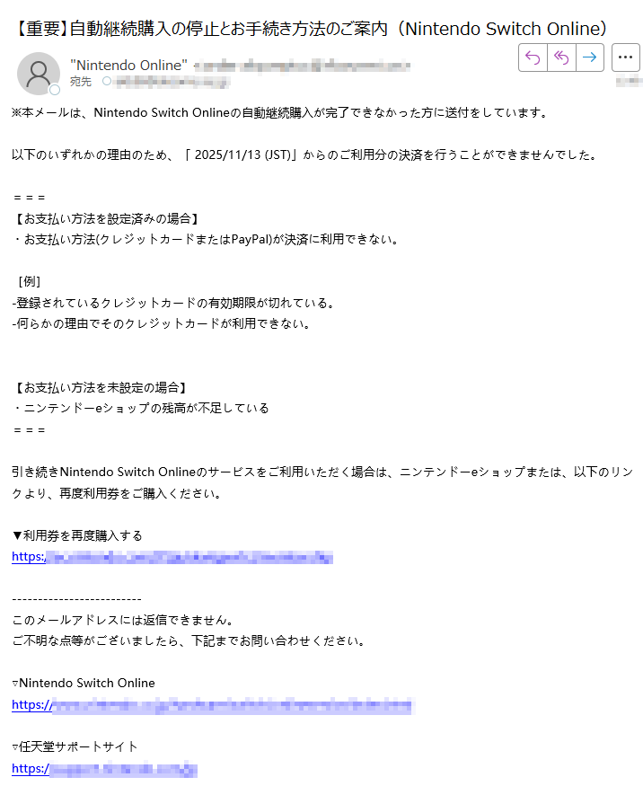 ![※本メールは、Nintendo Switch Onlineの自動継続購入が完了できなかった方に送付をしています。 以下のいずれかの理由のため、「 2025/11/13 (JST)」からのご利用分の決済を行うことができませんでした。 【お支払い方法を設定済みの場合】 ・お支払い方法(クレジットカードまたはPayPal)が決済に利用できない。 [例] -登録されているクレジットカードの有効期限が切れている。 -何らかの理由でそのクレジットカードが利用できない。 【お支払い方法を未設定の場合】 ・ニンテンドーeショップの残高が不足している 引き続きNintendo Switch Onlineのサービスをご利用いただく場合は、ニンテンドーeショップまたは、以下のリンクより、再度利用券をご購入ください。 ▼利用券を再度購入する https://このメールアドレスには返信できません。 ご不明な点等がございましたら、下記までお問い合わせください。 ▽Nintendo Switch Online https://▽任天堂サポートサイト https:// 任天堂株式会社 京都府](../../images/alert/2025/11m/nise_mail1113_15.png)