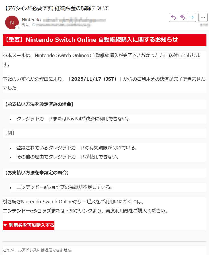 ![【重要】Nintendo Switch Online 自動継続購入に関するお知らせ ※本メールは、Nintendo Switch Onlineの自動継続購入が完了できなかった方に送付しております。 下記のいずれかの理由により、「2025/11/17(JST)」からのご利用分の決済が完了できませんでした。 【お支払い方法を設定済みの場合】•クレジットカードまたはPayPalが決済に利用できない。 [例]•登録されているクレジットカードの有効期限が切れている。 •その他の理由でクレジットカードが使用できない。 【お支払い方法を未設定の場合】•ニンテンドーeショップの残高が不足している。 引き続きNintendo Switch Onlineのサービスをご利用いただくには、ニンテンドーeショップまたは下記のリンクより、再度利用券をご購入ください。 ▼ 利用券を再度購入する このメールアドレスには返信できません。ご不明な点がございましたら、以下のリンクをご参照ください:•Nintendo Switch Online •任天堂サポートサイト 任天堂株式会社京都府](../../images/alert/2025/11m/nise_mail1117_09.png)